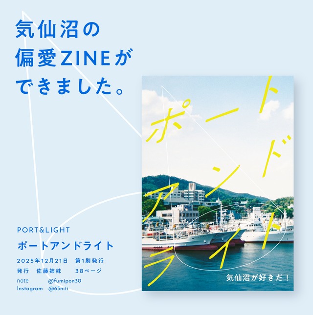 人口5.5万人の東北の港町、宮城県気仙沼市。 海のまちで育った地元ラブな姉妹ふたりで、自由気ままに「私たちが好きな気仙沼」を語るZINEをつくりました。 『ポートアンドライト』 2025年12月21日 第1刷発行 発行 佐藤姉妹 38ページ Writing @fumipon1217 Design @65niti